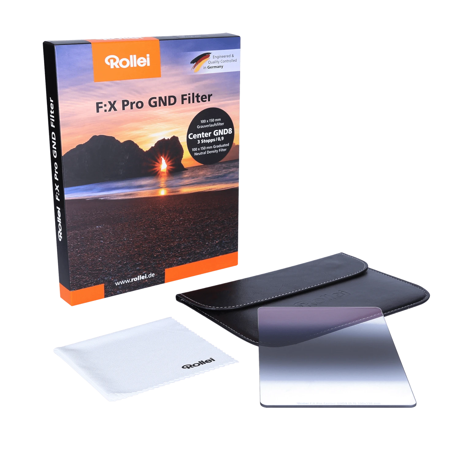Unser Rollei F:X Pro Center GND 8 (3 Stopps/0.9) ist ein sogenannter Grauverlaufsfilter oder auch Graduated Neutral Density Filter, der eine Tönung mit einem Verlauf aufweist. Bei Verlaufsfiltern läuft die Beschichtung in aller Regel zu einer bestimmten Seite aus, was beim Center GND aber nicht der Fall ist. Denn das Wort ‚Center‘ steht dafür, dass die Intensität der Tönung (Coating) von der Mitte des Filters in beide Richtungen der Außenseiten abnimmt und nicht etwa mit einem harten Schnitt in der Mitte endet, wie beispielsweise der Hard GND.