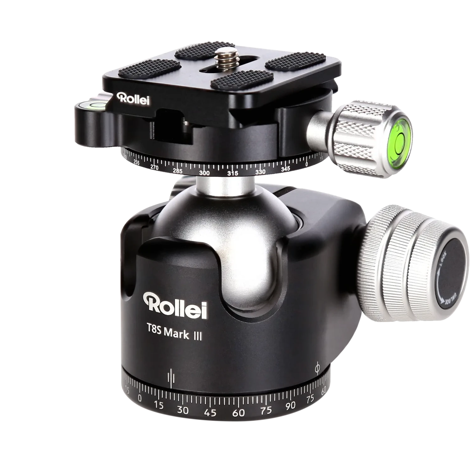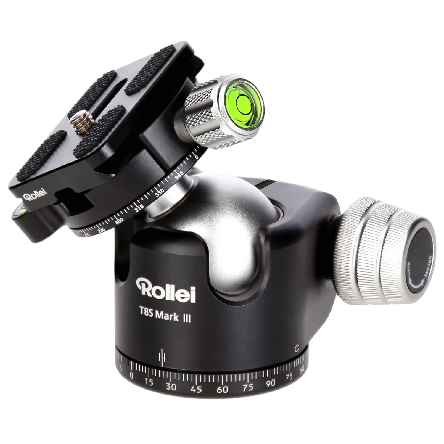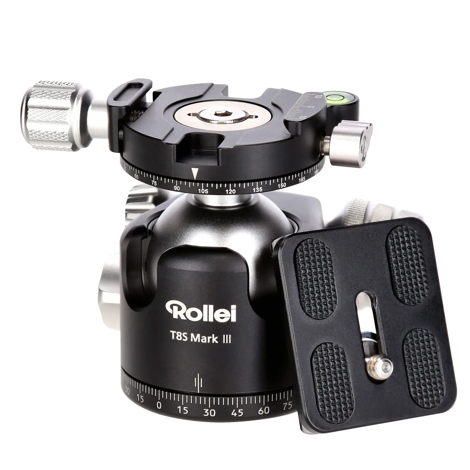 Das vielseitigste Mitglied der neuen Profi Kugelkopf-Generation von Rollei ist zweifellos der T8S Mark III Panoramakopf. Sorgfältig gefräst aus Qualitäts-Aluminium arbeiten die einzelnen Teile des Kopfes absolut spielfrei zusammen und alleine der Kopf erlaubt eine maximale Nutzlast von 22 kg. Diese Tragfähigkeit reicht sogar für Vollformat-Kameras aus, die mit Super-Teleobjektiven der Premium-Klasse bestückt wurden. Die Fixierung des Kugelelements hält die Maximallast selbst in den zwei, schnell zu wechselnden, 90°-Aussparung absolut sicher aufs Wunschmotiv gerichtet – Ihr Qualitäts-Garant für gestochen scharfe Langzeitbelichtungen und Filteraufnahmen. Die beiliegende Arca-Swiss-Schnellwechselplatte weist eine Länge von 50 mm auf und bietet ausreichend Kontaktfläche für besonders schwere Profi-Gehäuse und anderes High-End-Zubehör.